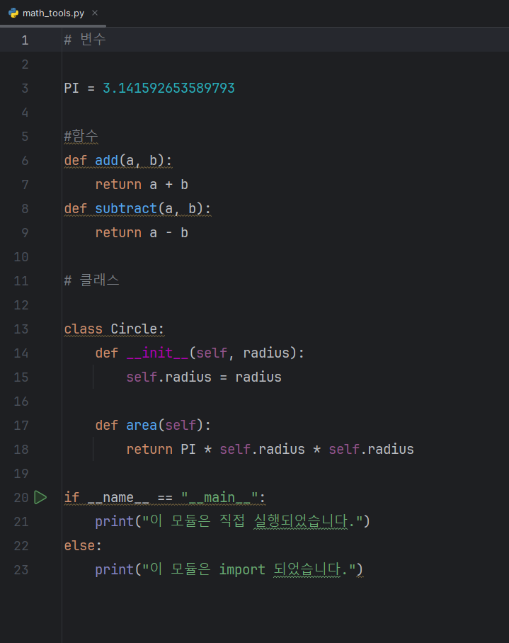 math_tools.py를 직접 실행하면 "이 모듈은 직접 실행되었습니다."가 출력되고, 다른 파일을 통해 실행하면 "이 모듈은 import 되었습니다."가 출력됩니다.