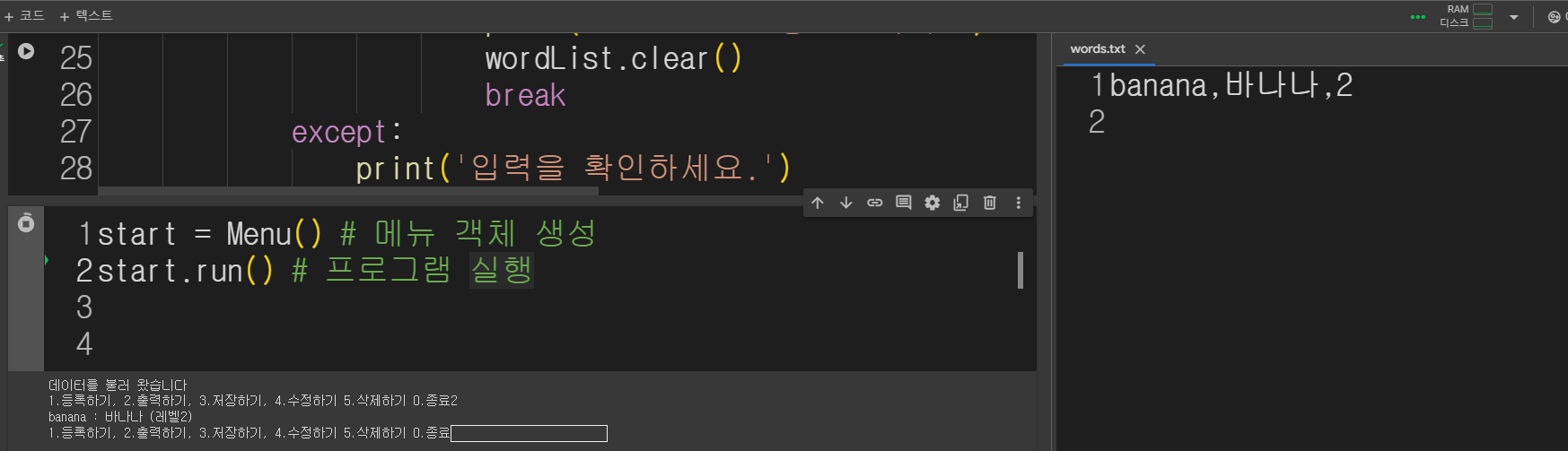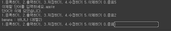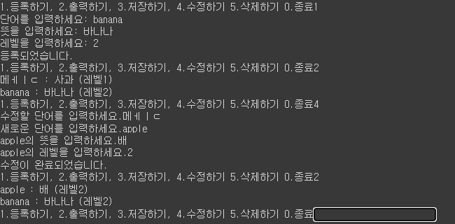 프로그램 시작시 기존에 단어장 파일이 존재하는지 확인하고 있으면 그 파일에 있는 데이터를 메모리에 불러옴(없으면 패스)