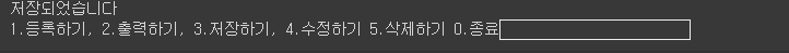 menu = int(input('1.등록하기, 2.출력하기, 3.저장하기, 4.수정하기 5.삭제하기 0.종료'))