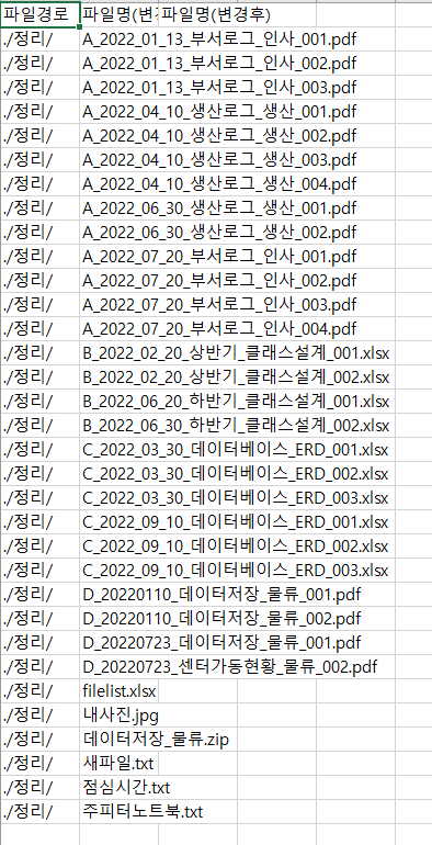 [('./정리/', 'A_2022_01_13_부서로그_인사_001.pdf', 'A_2022_01_13_부서로그_인사_001.pdf'), ('./정리/', 'A_2022_01_13_부서로그_인사_002.pdf', 'A_2022_01_13_부서로그_인사_002.pdf'), ('./정리/', 'A_2022_01_13_부서로그_인사_003.pdf', 'A_2022_01_13_부서로그_인사_003.pdf'), ('./정리/', 'A_2022_04_10_생산로그_생산_001.pdf', 'A_2022_04_10_생산로그_생산_001.pdf'), ('./정리/', 'A_2022_04_10_생산로그_생산_002.pdf', 'A_2022_04_10_생산로그_생산_002.pdf'), ('./정리/', 'A_2022_04_10_생산로그_생산_003.pdf', 'A_2022_04_10_생산로그_생산_003.pdf'), ('./정리/', 'A_2022_04_10_생산로그_생산_004.pdf', 'A_2022_04_10_생산로그_생산_004.pdf'), ('./정리/', 'A_2022_06_30_생산로그_생산_001.pdf', 'A_2022_06_30_생산로그_생산_001.pdf'), ('./정리/', 'A_2022_06_30_생산로그_생산_002.pdf', 'A_2022_06_30_생산로그_생산_002.pdf'), ('./정리/', 'A_2022_07_20_부서로그_인사_001.pdf', 'A_2022_07_20_부서로그_인사_001.pdf'), ('./정리/', 'A_2022_07_20_부서로그_인사_002.pdf', 'A_2022_07_20_부서로그_인사_002.pdf'), ('./정리/', 'A_2022_07_20_부서로그_인사_003.pdf', 'A_2022_07_20_부서로그_인사_003.pdf'), ('./정리/', 'A_2022_07_20_부서로그_인사_004 (1).pdf', 'A_2022_07_20_부서로그_인사_004.pdf'), ('./정리/', 'B_2022_02_20_상반기_클래스설계_001.xlsx', 'B_2022_02_20_상반기_클래스설계_001.xlsx'), ('./정리/', 'B_2022_02_20_상반기_클래스설계_002.xlsx', 'B_2022_02_20_상반기_클래스설계_002.xlsx'), ('./정리/', 'B_2022_06_20_하반기_클래스설계_001.xlsx', 'B_2022_06_20_하반기_클래스설계_001.xlsx'), ('./정리/', 'B_2022_06_30_하반기_클래스설계_002.xlsx', 'B_2022_06_30_하반기_클래스설계_002.xlsx'), ('./정리/', 'C_2022_03_30_데이터베이스_ERD_001.xlsx', 'C_2022_03_30_데이터베이스_ERD_001.xlsx'), ('./정리/', 'C_2022_03_30_데이터베이스_ERD_002.xlsx', 'C_2022_03_30_데이터베이스_ERD_002.xlsx'), ('./정리/', 'C_2022_03_30_데이터베이스_ERD_003.xlsx', 'C_2022_03_30_데이터베이스_ERD_003.xlsx'), ('./정리/', 'C_2022_09_10_데이터베이스_ERD_001 (1).xlsx', 'C_2022_09_10_데이터베이스_ERD_001.xlsx'), ('./정리/', 'C_2022_09_10_데이터베이스_ERD_002.xlsx', 'C_2022_09_10_데이터베이스_ERD_002.xlsx'), ('./정리/', 'C_2022_09_10_데이터베이스_ERD_003.xlsx', 'C_2022_09_10_데이터베이스_ERD_003.xlsx'), ('./정리/', 'D_20220110_데이터저장_물류_001.pdf', 'D_20220110_데이터저장_물류_001.pdf'), ('./정리/', 'D_20220110_데이터저장_물류_002.pdf', 'D_20220110_데이터저장_물류_002.pdf'), ('./정리/', 'D_20220723_데이터저장_물류_001.pdf', 'D_20220723_데이터저장_물류_001.pdf'), ('./정리/', 'D_20220723_센터가동현황_물류_002.pdf', 'D_20220723_센터가동현황_물류_002.pdf'), ('./정리/', '내사진.jpg', '내사진.jpg'), ('./정리/', '데이터저장_물류.zip', '데이터저장_물류.zip'), ('./정리/', '새파일1_복사본.txt', '새파일.txt'), ('./정리/', '압축푸는곳', '압축푸는곳'), ('./정리/', '점심시간.txt', '점심시간.txt'), ('./정리/', '주피터노트북.txt', '주피터노트북.txt')]