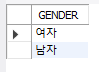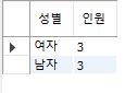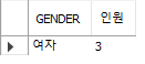 SELECT GENDER AS '성별', COUNT(USERID) AS '인원' FROM MEMBER GROUP BY GENDER;