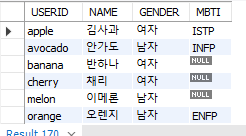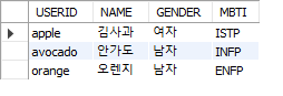 #DELETE FROM MEMBER WHERE USERID='AVOCAD'; # 삭제할려는 데이터가 없어도 실행은 되지만 데이터가 없어서 삭제되지 않는다