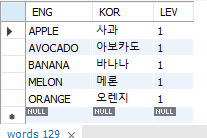 INSERT INTO WORDS (LEV, ENG, KOR) VALUES(2, 'AVOCADO', '아보카도'); # 필드 순서에 상관없다