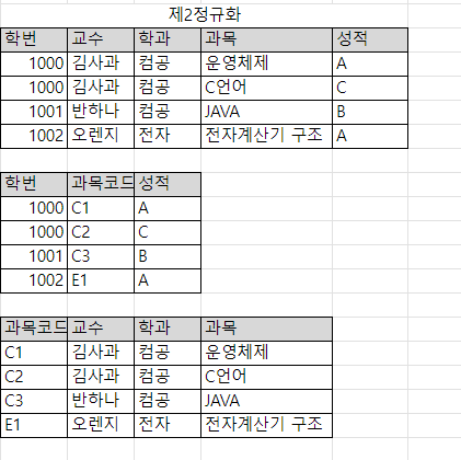 - 2NF를 만족하면서, 기본키에 대해 이행적 함수 종속이 되지 않는 것을 의미
