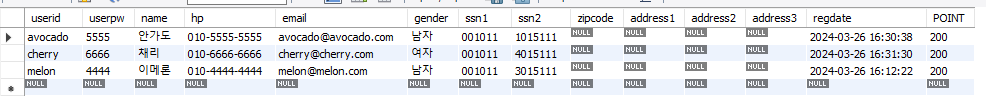 ('avocado', '5555', '안가도', '010-5555-5555', 'avocado@avocado.com', '남자', '001011', '1015111', 200);