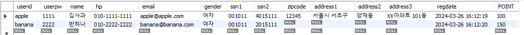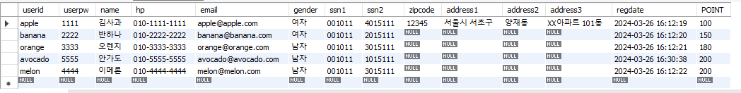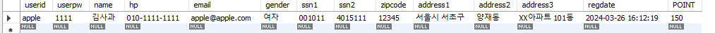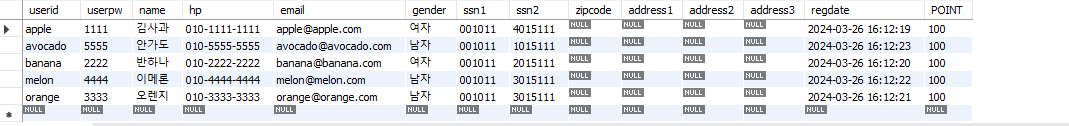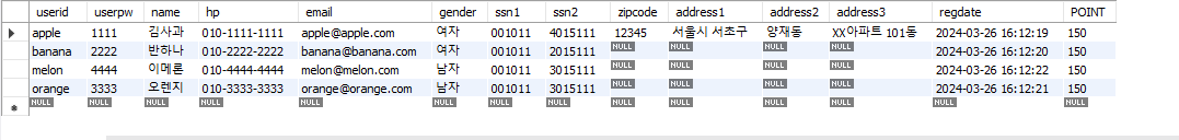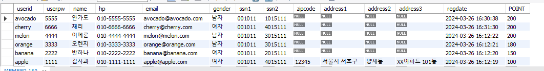 -- INSERT INTO MEMBER (USERID, USERPW, NAME, HP, EMAIL, GENDER, SSN1, SSN2, ZIPCODE, ADDRESS1, ADDRESS2, ADDRESS3, POINT)