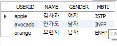SELECT M.USERID, NAME, GENDER, MBTI FROM MEMBER AS M INNER JOIN PROFILE AS P