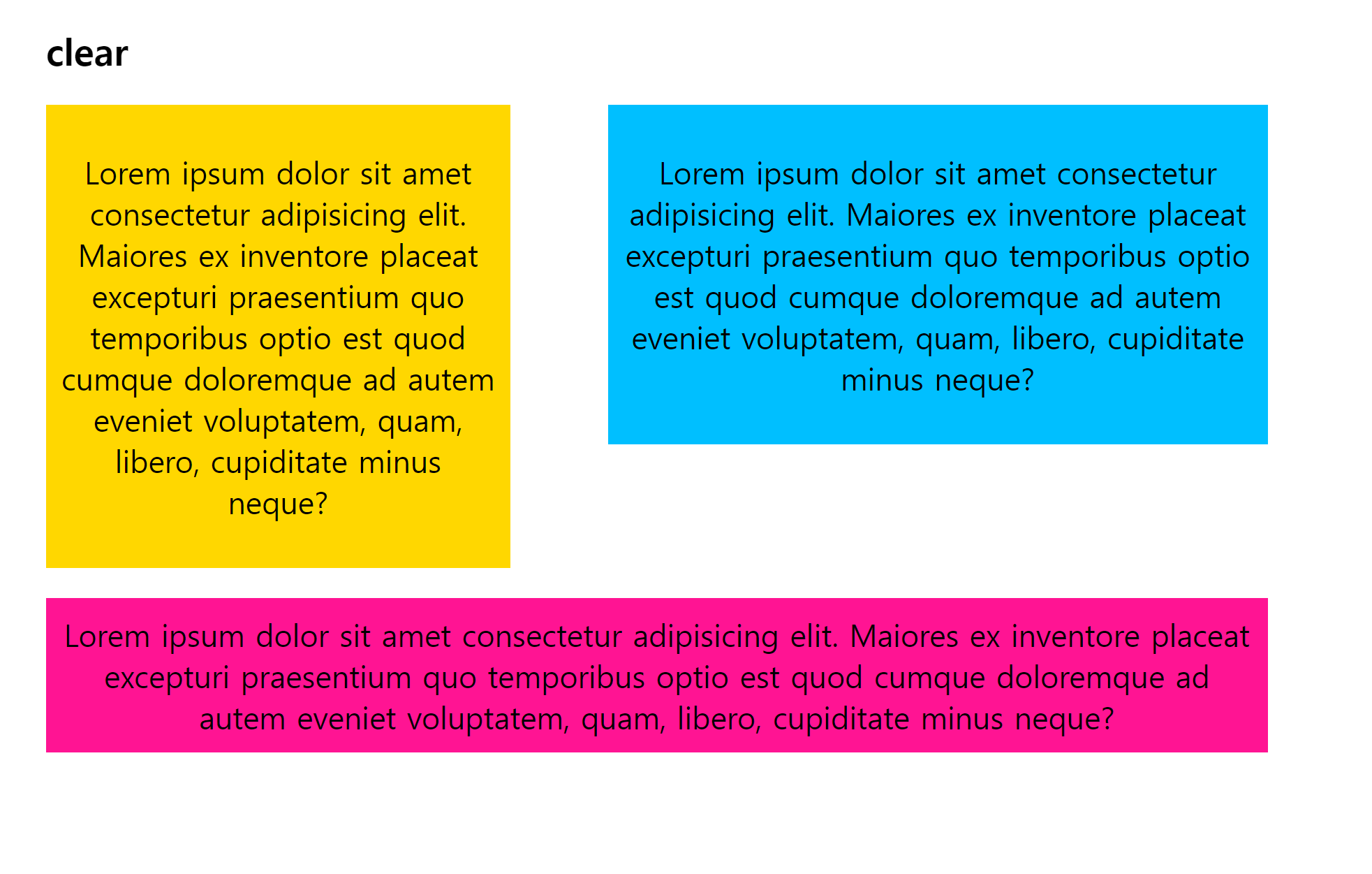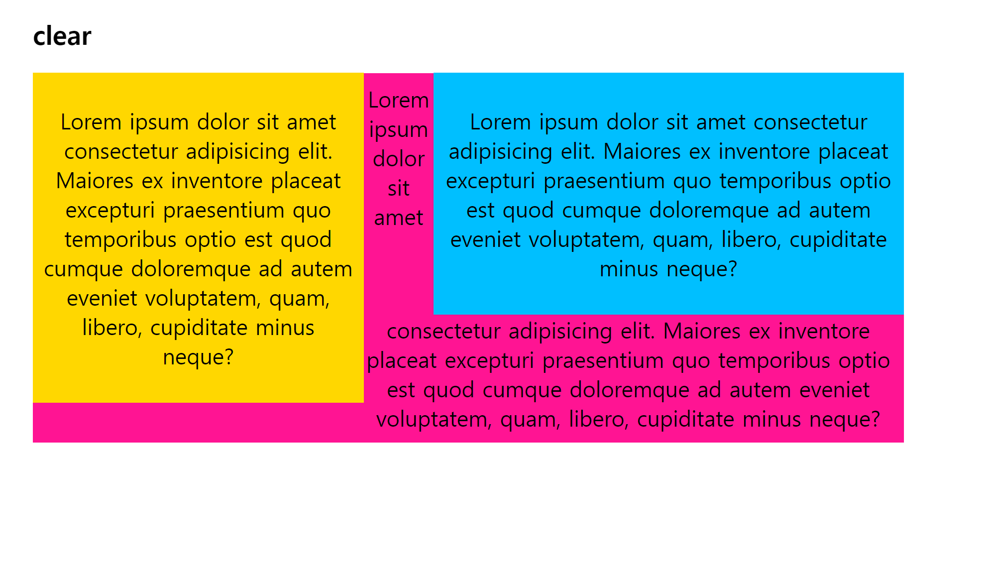 - clear 속성을 이용하여 float 이후에 등장하는 요소들이 더이상 float 속성에 영향을 받지 않도록 설정(left, right, both)